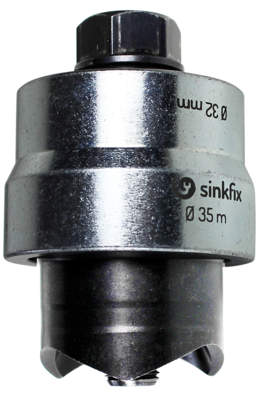 Kaksipuolinen 2in1-reikämeisti, jossa on 3 leikkuuterää puolta kohden, tekee joko 32 tai 35 mm reiän samalla työkalulla