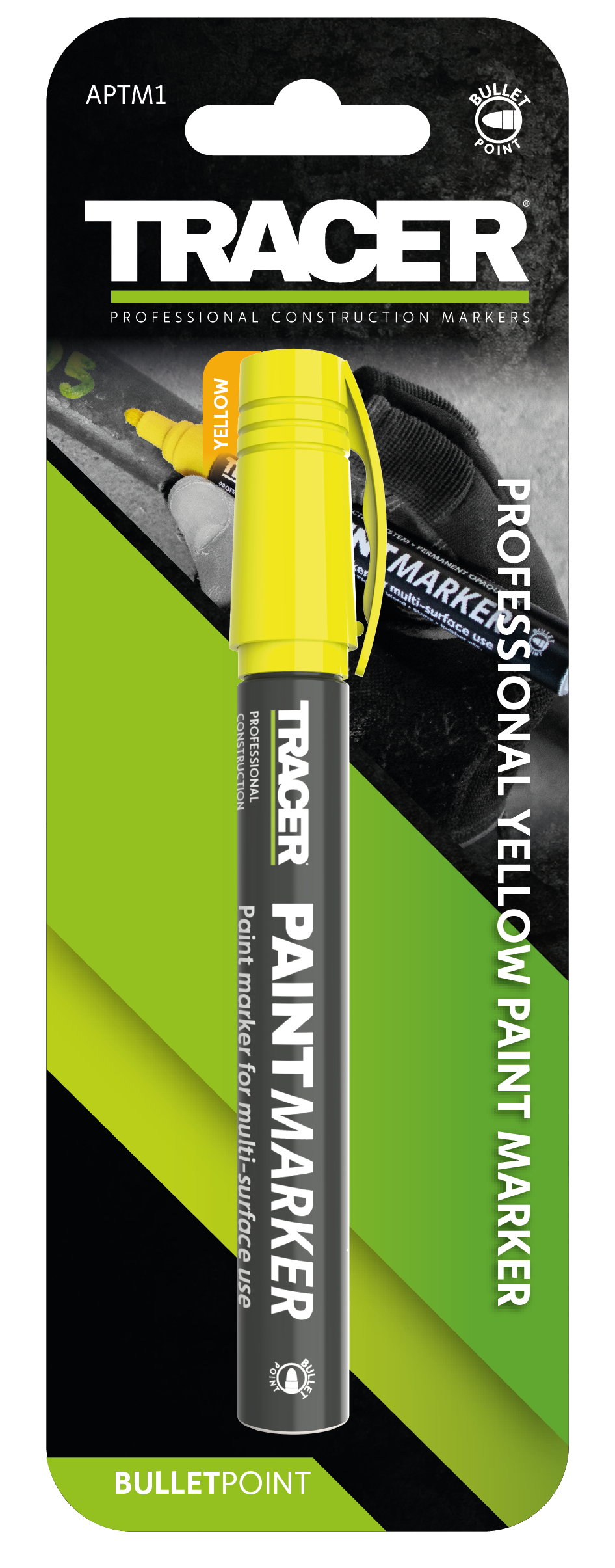 Korkeanäkyvyyksinen merkkauskynä Keltainen joka sopii työmaakäyttöön ja toimii myös kirkkailla pinnoilla.