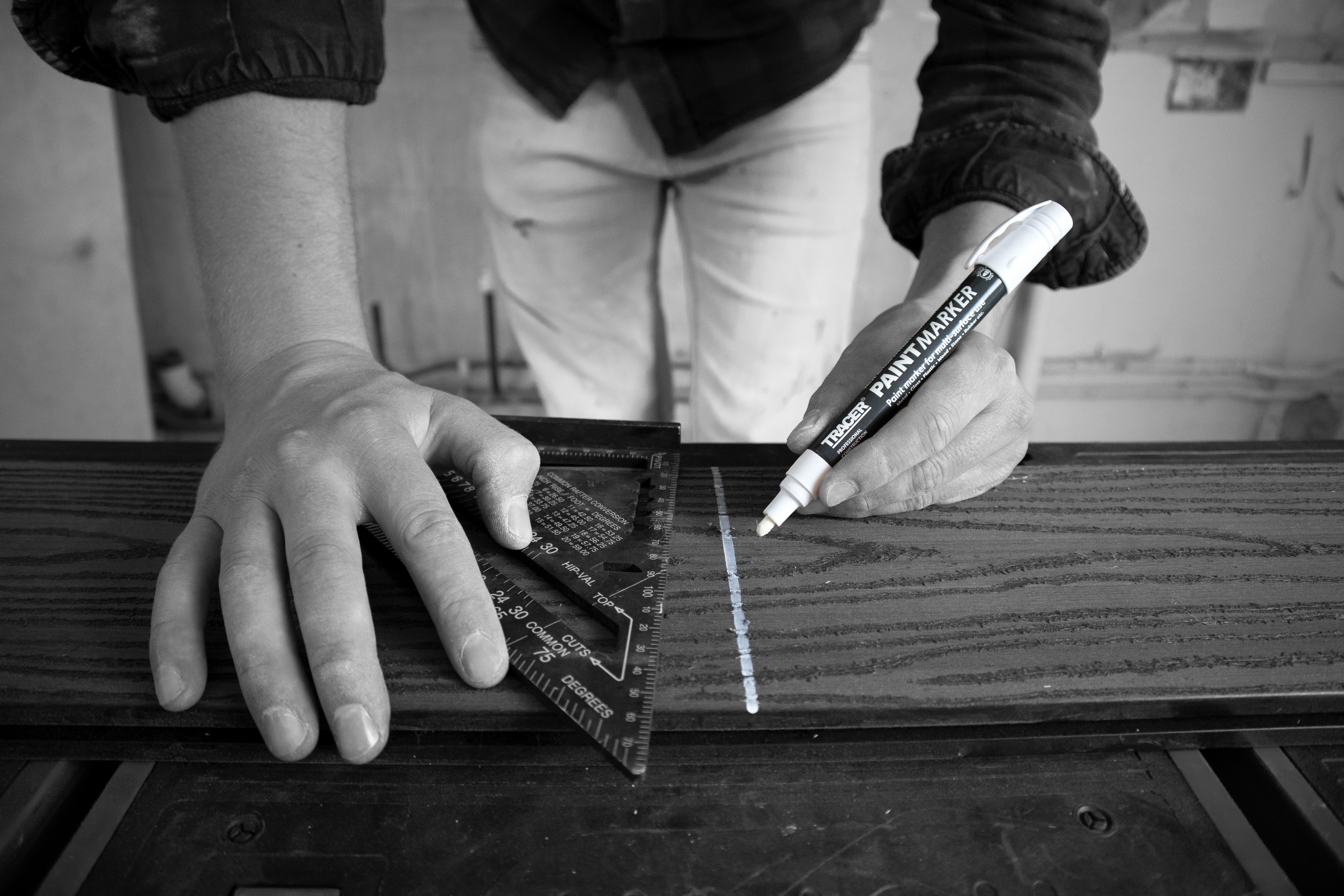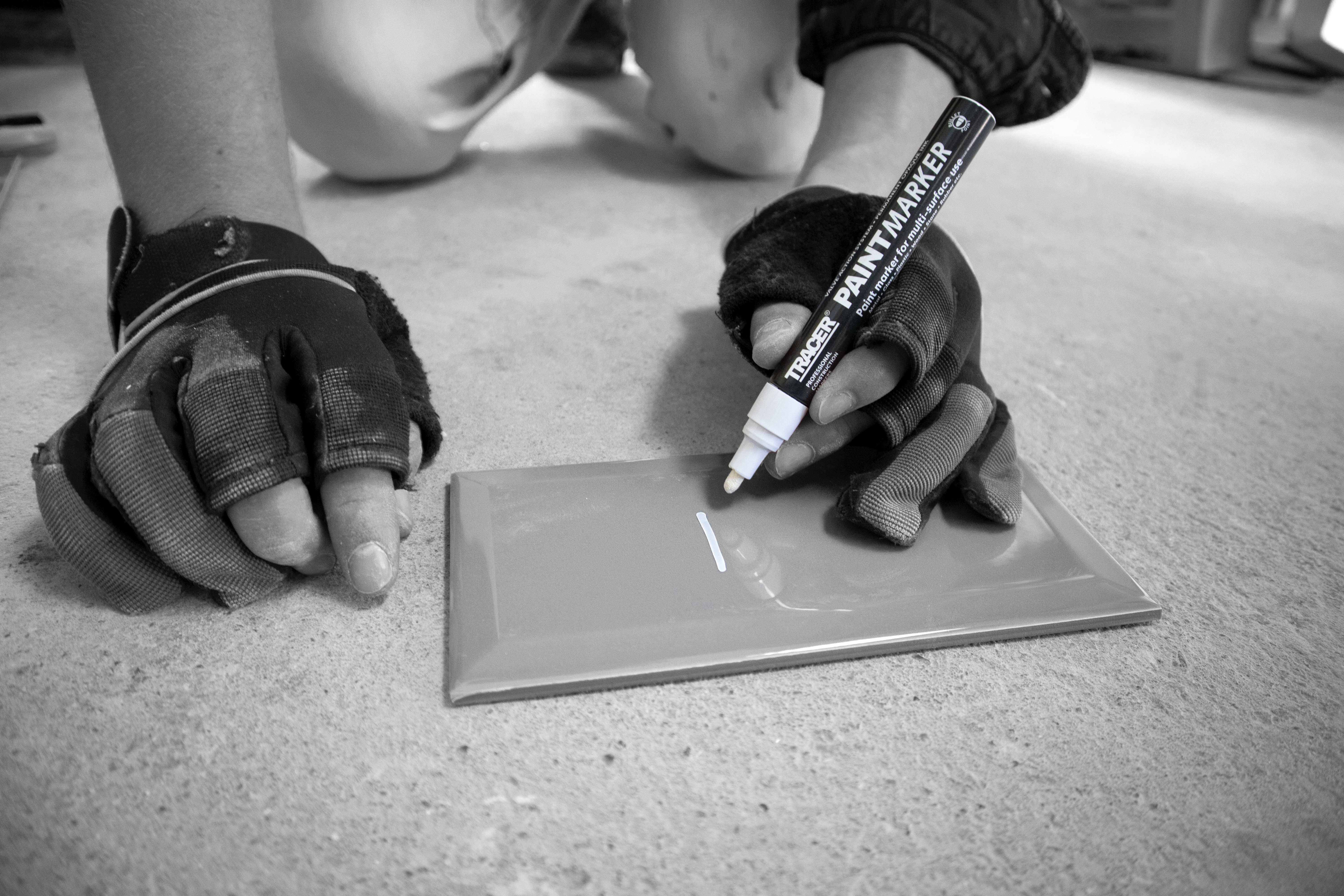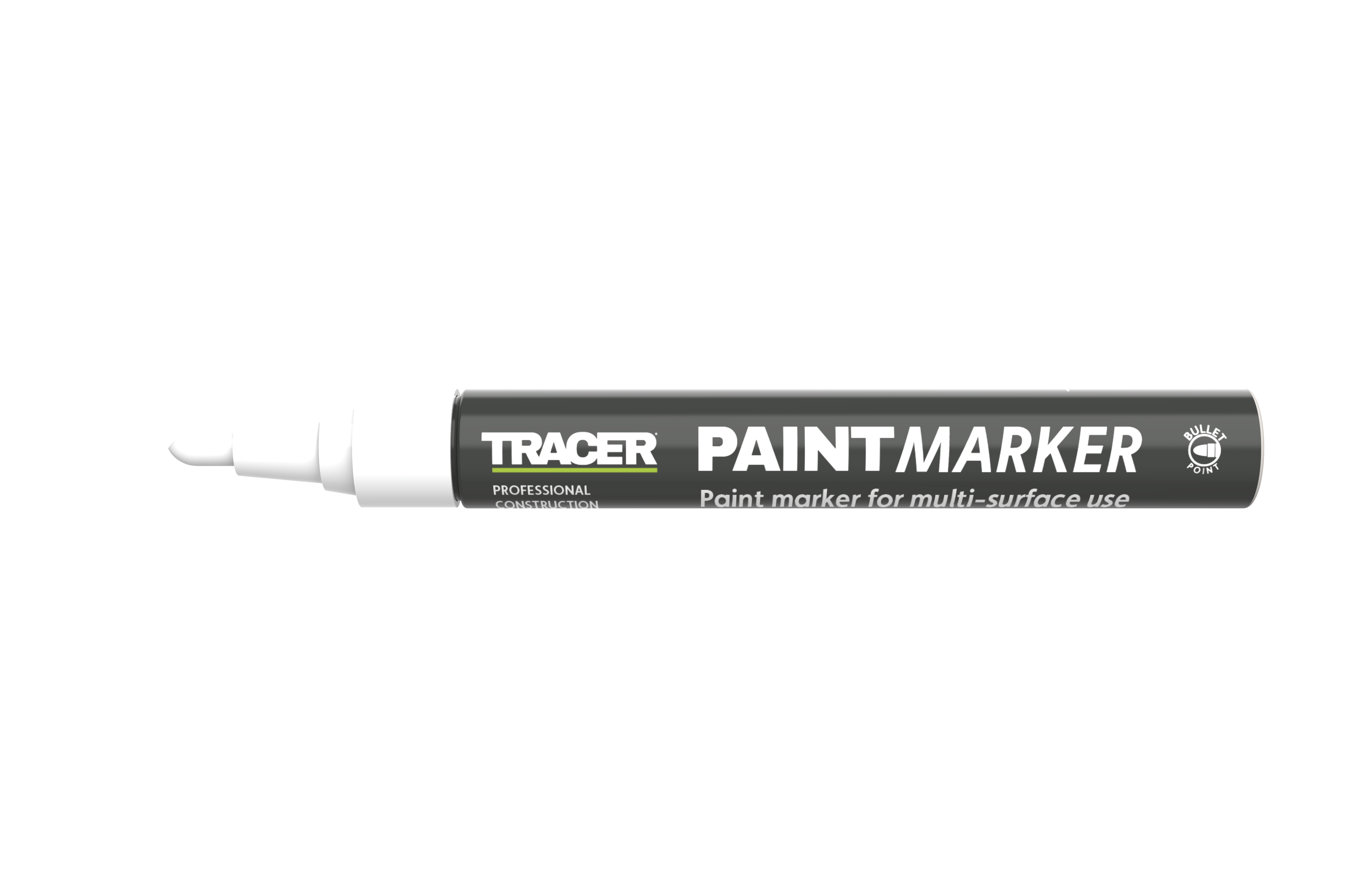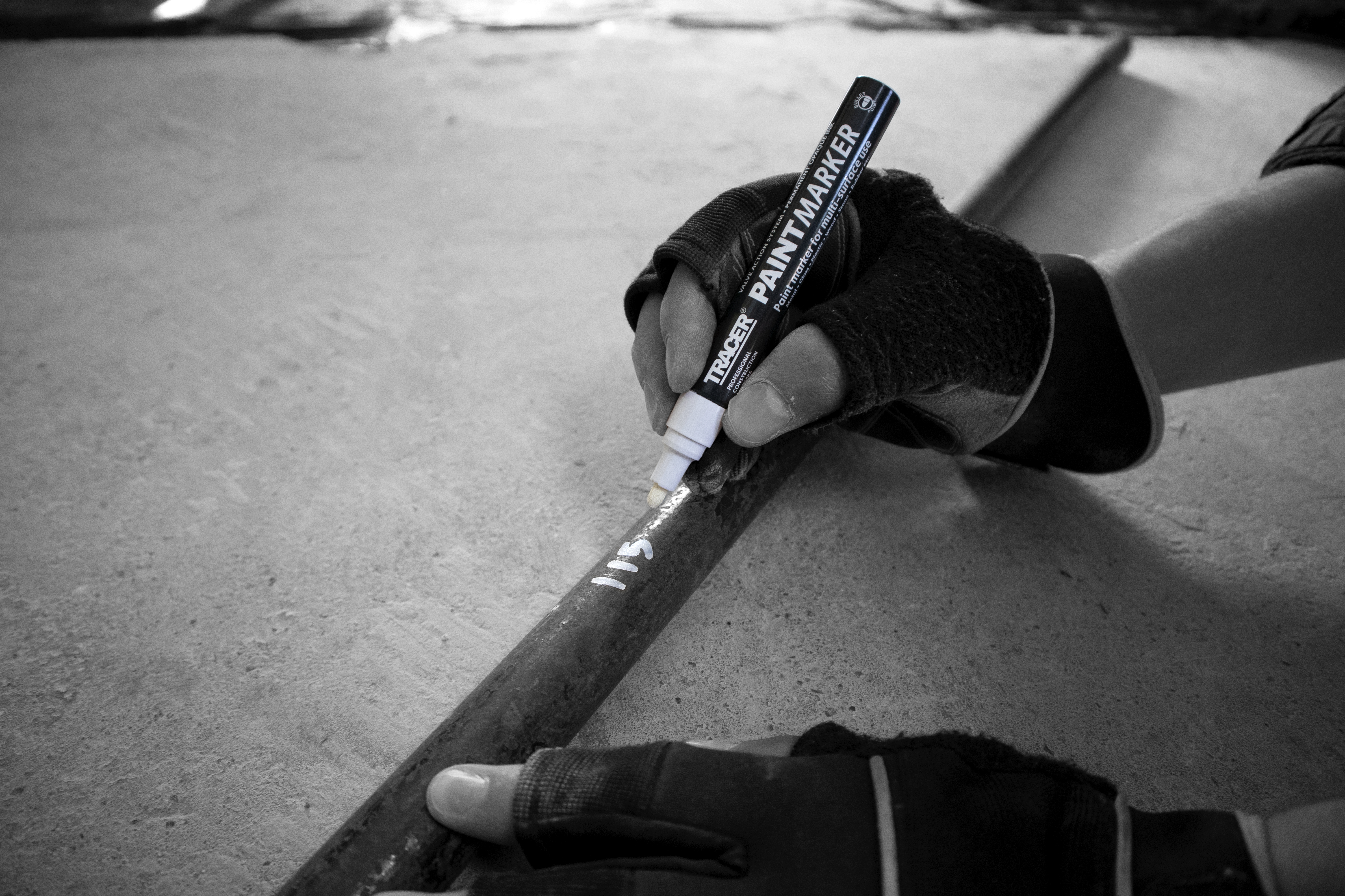 Korkeanäkyvyyksinen merkkauskynä Valkoinen joka sopii työmaakäyttöön ja toimii myös kirkkailla pinnoilla.