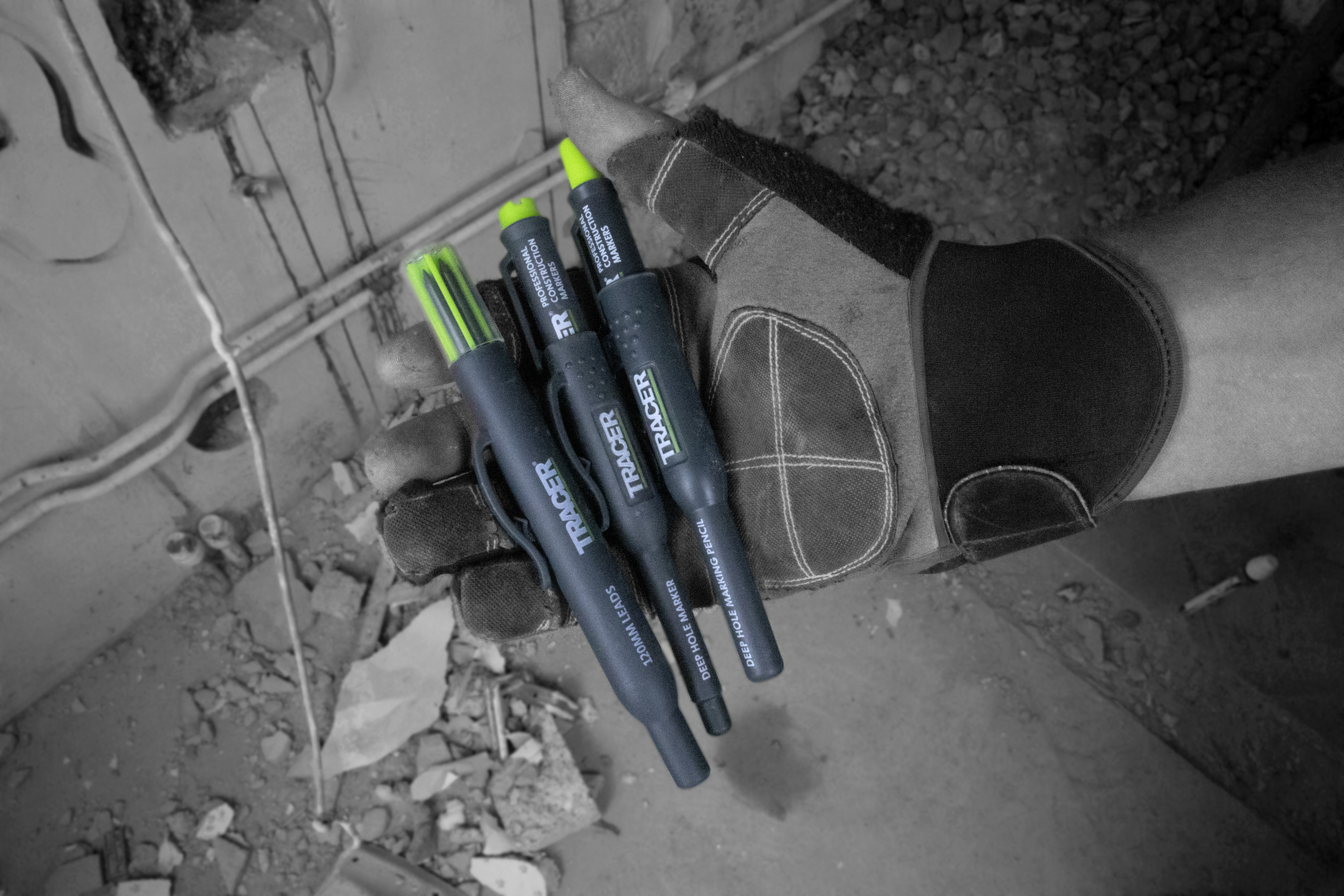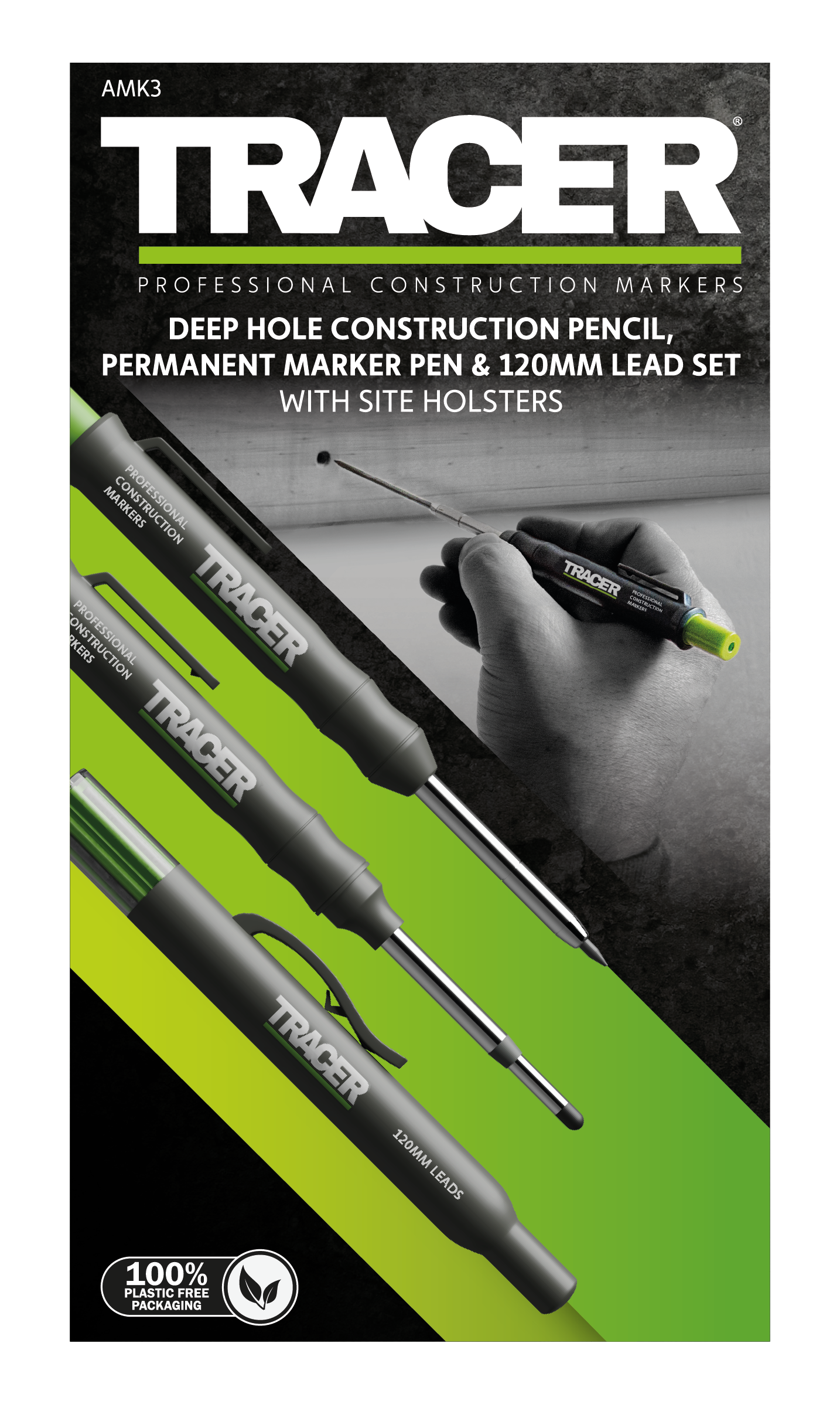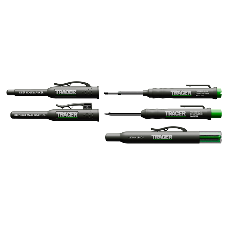 Kattava sarja rakentajan merkkaustarpeisiin jossa kaksoiskärkinen merkkauskynä, reiänmerkkauskynä ja paketti vaihtolyijyjä (6 x 2B grafiitti) sekä kotelo.