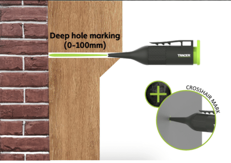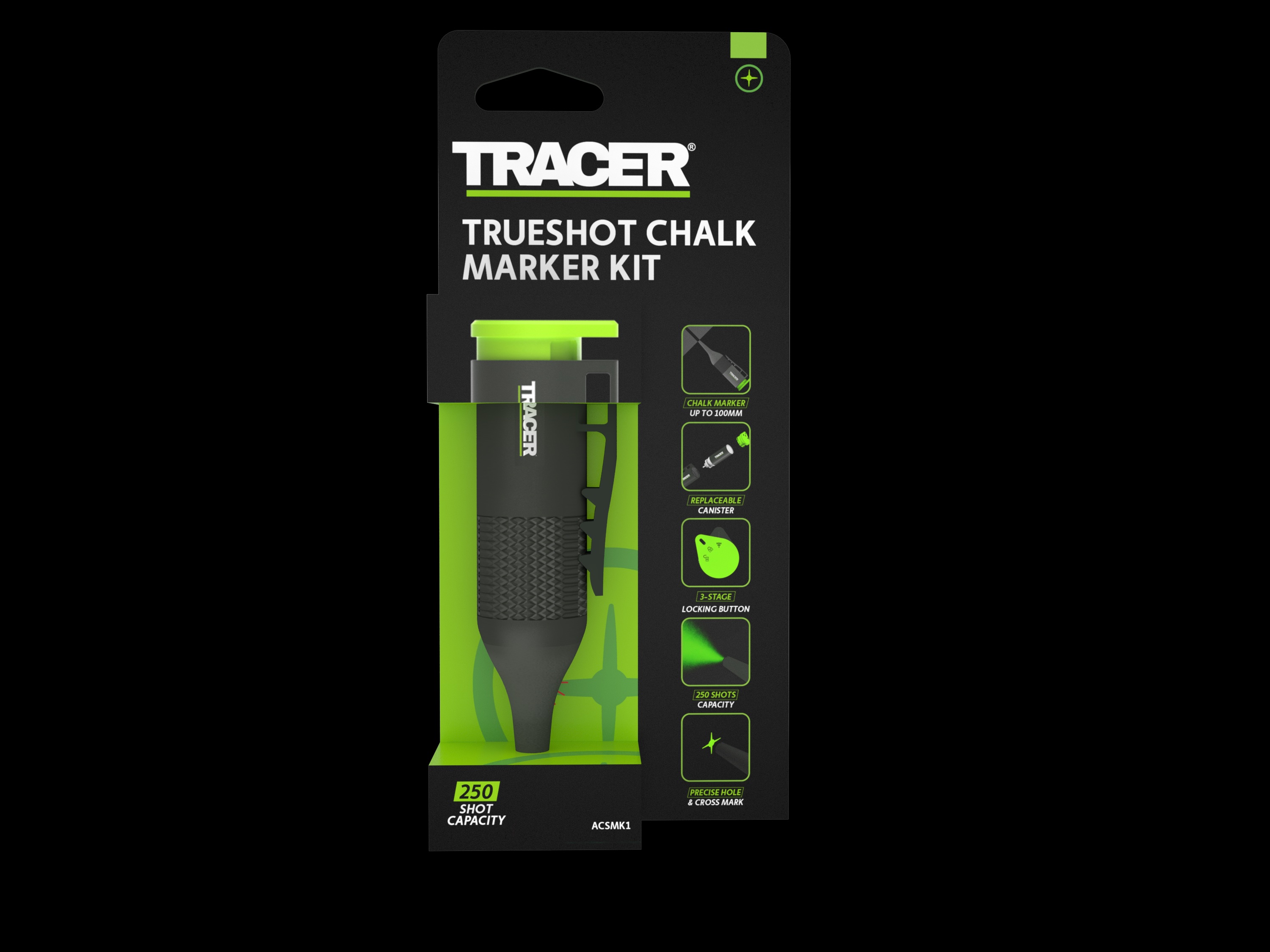 Trueshot on syväreikäinen vihreä kalkkimerkintäväline 0–100 mm syvyyksiin, vaihdettavalla säiliöllä ja kolmiportaisella lukitusmekanismilla nopeaan ja siistiin merkintään.